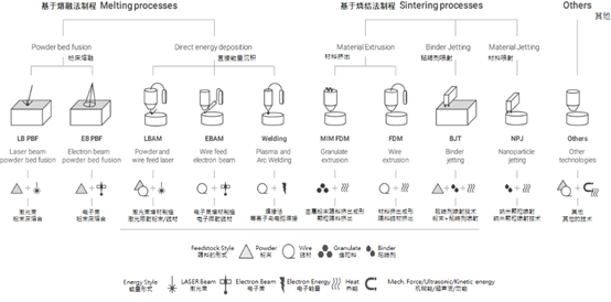 2.3MAM以金屬粉末做為增材制造成形的方式目前有許多的方式,如圖4所表示。大致分成三大類,即將金屬粉末直接熔融法制程(Melting process)和燒結(jié)法制程(Sintering process),這些技術(shù)沒有統(tǒng)一的標準,不過隨著技術(shù)的演變,也逐漸將材料、設(shè)備與方法清楚分類,并朝著更小的堆積層分辨率邁進,使用較小范圍的激光光斑、低溫成形(噴膠打印)、高溫同步固化,逐漸擴大產(chǎn)品量產(chǎn)的應(yīng)用范圍以及產(chǎn)出效率的提升,或是朝更高分辨率前進。