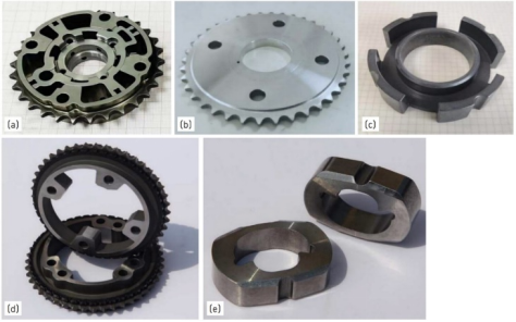 5. 每件產(chǎn)品的重量都超過100g以上的不同PM制品展示,:(a)VVT(可變氣門正時)轉(zhuǎn)子/鏈輪;(b)鋁合金鏈輪;(c)軟磁定子;(d)橡膠包覆進/排氣凸輪軸定子鏈輪(本零件榮獲世界PM2018產(chǎn)品獎);(e)密度≥7.53 g/cm3的打擊塊(本零件榮獲世界PM2018產(chǎn)品獎),所有照片均由寧波東睦集團NBTM提供。4.2 MIM製品MIM制品如圖6所表示,都是一些形狀復(fù)雜的零件且產(chǎn)品重量沒有超過50g,大部分都低于10g甚至有0.5g的小產(chǎn)品。 圖6.