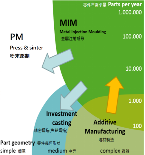 圖7.MAM的最新微米級3D打印5. PM/MIM/MAM工藝的產(chǎn)出能力答:如圖8非常淺顯易懂的表示三個工藝的產(chǎn)出能力特色。PM僅能制作中度復(fù)雜特征,但能制作大件/量大的訂單;MIM可以制作復(fù)雜特征產(chǎn)能很大,但是重量不大;MAM則是數(shù)量不多,但制品的重量和復(fù)雜度都沒有限制。特別是MIM原本僅是取代精密鑄造(Investment casting, 又稱熔模鑄造、失蠟鑄造或脫蠟鑄造),但是逐漸有侵入老大哥PM的領(lǐng)域,未來會更加大零件重量與尺寸的制造能力。