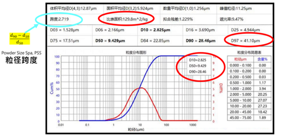 圖8.三大粉末成形技術(shù)的產(chǎn)出能力表示圖6.什么是d50(粉末平均粒徑的中值)?答:請見下圖9所表示,這是常見的激光粒度儀檢驗后的綜合數(shù)據(jù)、表格與圖形。這圖是非常重要的粉末性能報告,一定要了解之中的含意。
